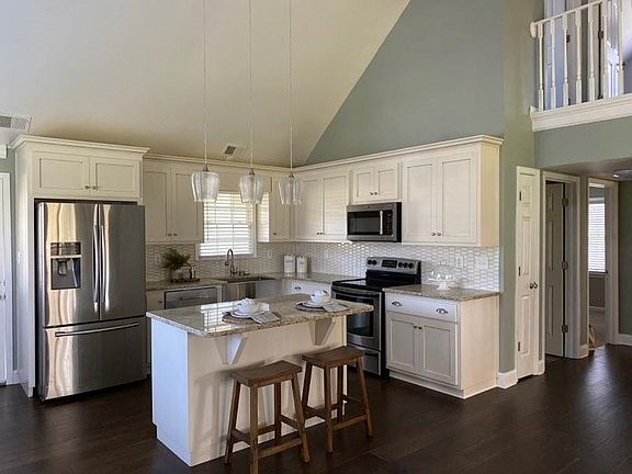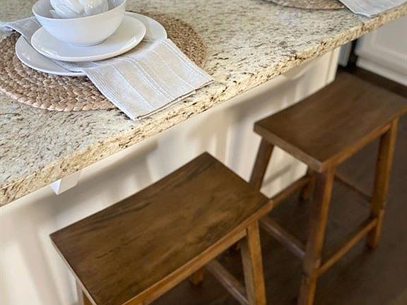 - Kitchen Features: Breakfast Bar, View to Family Room, Stone Counters, Kitchen Island, Cabinets White
