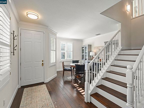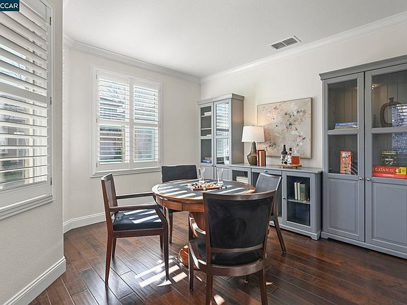 This beautifully appointed corner-lot residence in The Orchards offers 3 bedrooms plus a versatile loft (ideal as a 4th bedroom, office, or media space) and 2.5 baths, showcasing a spacious open-concept floor plan designed for both comfort and style. The HOA maintains the front yard landscaping, providing a polished exterior with low-maintenance living. The home features numerous upgrades throughout, including quartz kitchen countertops, stainless steel appliances, engineered hardwood floors, a refaced fireplace, vinyl shutters and a fresh coat of interior paint. The kitchen flows effortlessly into the family room, enhanced by a center island, engineered hardwood flooring, and refined finishes that create a warm yet sophisticated ambiance. The spacious primary suite serves as a true retreat, featuring dual vanities, a sunken soaking tub, a separate stall shower, and a generous walk-in closet. Ideally located near top-rated schools within the SRVUSD, this home also offers convenient access to freeways, shopping, and dining. Enjoy close proximity to the vibrant San Ramon City Center, with its upscale restaurants, boutique shops, and community amenities—perfectly blending comfort, convenience, and lifestyle.