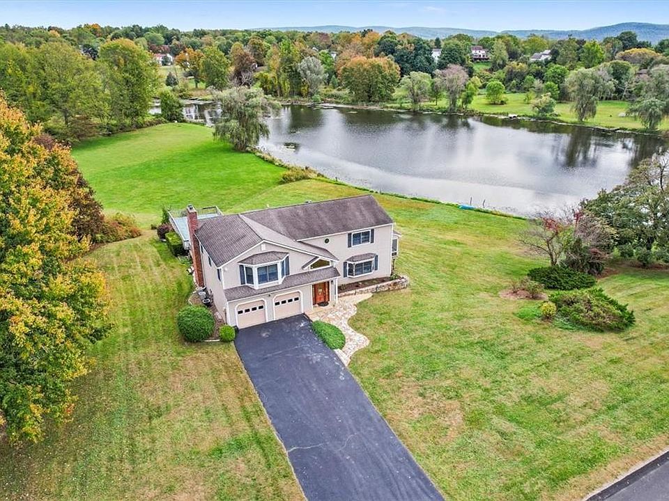 Experience breathtaking lake views year-round with opportunities for fishing, boating, and ice skating. This stunning home, filled with natural light, offers a spacious eat-in kitchen complete with granite countertops, stainless steel appliances, and a cast iron sink. French doors lead to a generously sized family room with a brick fireplace. The formal living and dining rooms feature hardwood floors with walnut inlay and crown molding. The primary bedroom boasts a vaulted ceiling, accompanied by three additional bedrooms and a large bonus room. Enjoy the three-season room with sliders leading to a vast deck and a 20x40 pool with a new liner. Beautifully landscaped property, irrigation system, sun shades, and much more. Additional Information: Amenities:Storage,HeatingFuel:Oil Above Ground,ParkingFeatures:2 Car Attached,