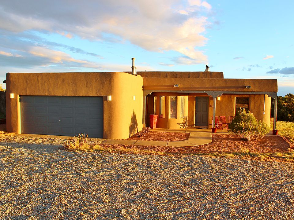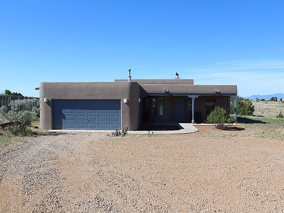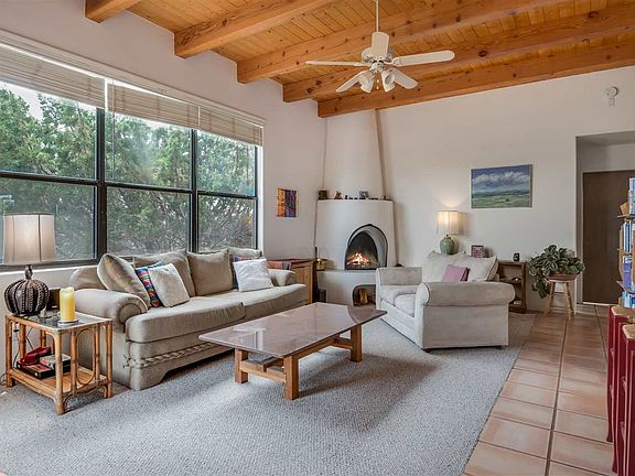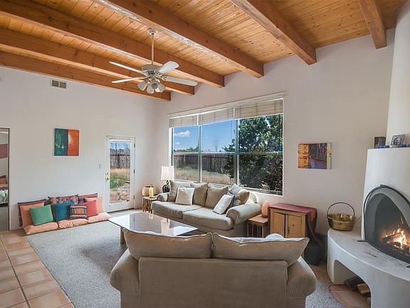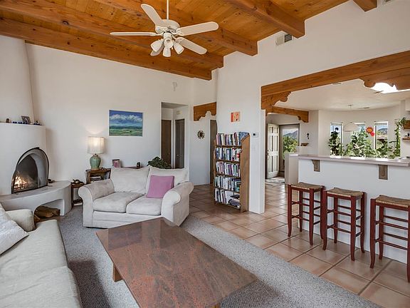 Located near the Agora shopping Center/Village, elementary school, library and community center, this home offers warmth, light, and convenience. The setting and generous lot creates privacy from neighbors, plus fabulous head-on views of Sangre de Cristos. Living room opens to dining area, and the classic kiva fireplace and vigas create an inviting entertaining space. There are tile floors throughout main living area, and a generous master bedroom/ bathroom. Enjoy lovely sunsets and Jemez Mountain views from the portal, and enclosed private backyard!