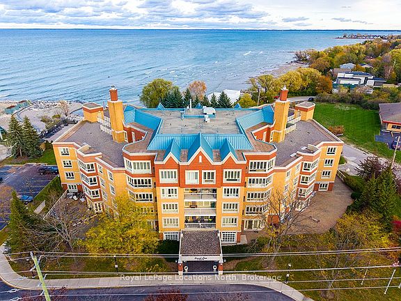 Collingwood's Exclusive Sunset Cove Waterfront Condo Community has a rare offering; an updated end unit with unobstructed PANORAMIC Georgian Bay Views! Located in a private, quiet corner of the 4th floor, this 1,289 sqft, 2 bedroom, 2 full bathroom condo is flooded with natural light all day long. The floorplan allows for layout options with a wide, oversized living space to include a dining + reading + lounging space. Enjoy cozy nights in front of the fireplace watching our local surfers conquer the Bay. The primary suite also has a water view + walk-in closet + 5pc ensuite and the spare bedroom converts easily to a den/sitting room with its beautiful Murphy Bed. Enjoy the upscale convenience and security of Sunset Cove, with heated underground parking, storage, library, patio/BBQ area, professionally maintained grounds & always friendly concierge service. The Gathering Room welcomes residents to enjoy the pool table, ping-pong, viewing parties & kitchen facilities. During warmer months, enjoy the salt water pool and private sandy beach on the shores of Georgian Bay. Sunset Cove is a short walk from all our historic downtown has to offer; restaurants, shopping, waterfront, parks & more. If you are looking for luxurious, effortless living with convenience, warmth and community, book your private viewing today.
