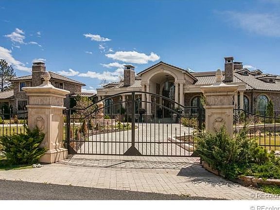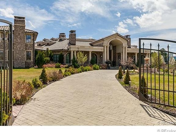 Located behind stately wrought-iron gates on a coveted road in Cherry Hills, this extraordinary contemporary European-style home has an open floor plan that is perfect for entertaining. A soaring foyer flows into a chef's gourmet kitchen, a spacious Great Room and dining room, a formal living room, and home cinema. Finely crafted interior finishes elaborate plaster work ceilings and moldings, hand-carved fireplaces, and a curved marble staircase with a custom wrought-iron banister. Upstairs you will find warm walnut hardwood floors in the bedrooms. A master suite has his and her bathrooms and custom dressing rooms. The home has an indoor hand painted tile pool surrounded by arched floor-to-ceiling french doors that open to a veranda and mountain views. An attached guest house includes a living room, kitchen, patio, laundry room, and its own two-car garage.