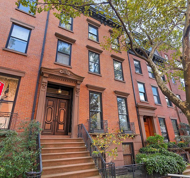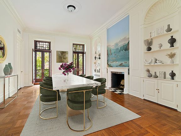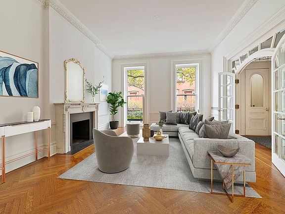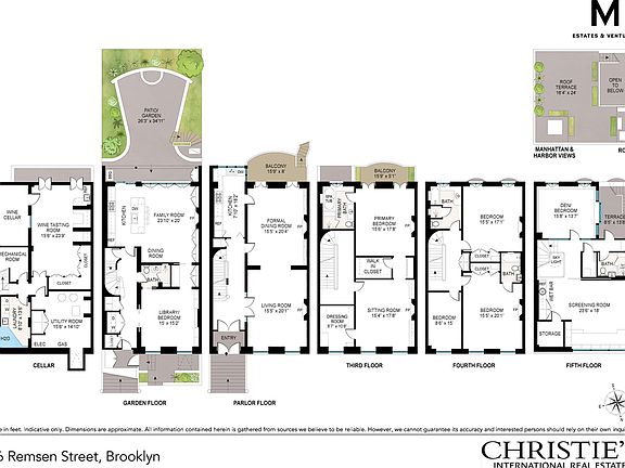 Located on one of the most exquisite blocks in Brooklyn Heights, 16 Remsen Street is a magnificent five-story townhouse that boasts an impressive 26-foot width, finished cellar, and four outdoor spaces. The stunning home, spanning over 6,500 square feet, offers six bedrooms, five bathrooms, and numerous formal and casual eating, dining, and entertaining spaces. The grand home's public gathering areas are perfect for lavish entertaining and intimate gatherings alike, with highlights including a wine tasting room with a 2,500 bottle wine cellar, a sprawling white Carrara marble kitchen, a casual living and dining room, and a landscaped brick patio and garden. The parlor floor is particularly impressive, featuring two fireplaces and a fully equipped entertaining kitchen, while the fifth floor screening room offers breathtaking city views. The gracious bedroom floors are equally impressive, with a third-floor master suite boasting two dressing rooms, a balcony, and a library with a gas fireplace, and a fourth floor with three bedrooms and two bathrooms. The fifth floor, with its stunning original stained glass skylight, offers flexible uses with a huge media room, a separate office or additional bedroom, a full bathroom, and wet bar. Additional luxuries of this remarkable home include two laundry rooms, abundant closets and built-in storage, garden and terrace irrigation systems, wiring for internet and audio/visual components, and multi-zone heat and air conditioning systems. Built in 1845 and renovated with outstanding detail and craftsmanship, 16 Remsen Street is undoubtedly one of the true treasures of this coveted neighborhood. Not to be missed, the highlight of the home is the incredible roof deck, boasting breathtaking views of the Manhattan skyline, the waters of NY Harbor, and the green spaces of Brooklyn Bridge Park