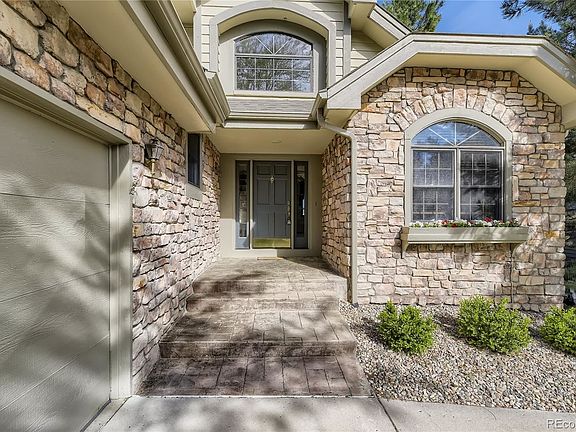 Fantastic traditional type two-story home w private master upper level suite. Located in a well sought after at the end of the cul-de-sac in the desirable The Hamlet gated community. Set back overlooking the 9th hole at The Ridge at Castle Pines North golf course. Offering views, privacy & security within desirable & quiet gated community with mature foliage. Many large windows for light, 13' vaults in grand entry, 13' vaulted ceilings in living and dining rooms featuring a gas log fireplace. The formal dining area has 20 foot ceilings and lot's of natural light. The Primary suite is large and has a dual large walk in closets. The Primary bath is full of luxurious features including a shower, dual sinks, and a large soaking tub. Two private patios with steps up to the wooded, private, grass yard which creates a resort ambiance. Finished basement with 3 additional bedrooms & full bathroom along with a very large storage space. Large family room with a wet bar and another gas fireplace that is part of a large family room, breakfast, kitchen area. Wonderful access off kitchen/breakfast to main deck. Study on main floor or 3rd bedroom on lower floor is well suited for a private study and walk out to private patio. Wood flooring and carpet throughout this entire home. Large mud room/laundry room on main floor adjacent to oversized 3 car heated garage, vacuum system, water faucets, and with an attic (pull down stairs ) for additional storage. Walkout basement includes 3 additional bedrooms, full bath and lots of rec space/hobby room and lots of storage. Close to walking trails & Daniels Park, The Ridge golf course and restaurant, King Sooper (grocery), I-25 access, 15 min to Park Meadows, 20 min to DTC, 35 to DIA and close to new Castle Rock shopping area -Whole foods and Great restaurants and outlet mall! Nearby area parks & trails. Combining the golf course community coupled w/ the peaceful & tranquil setting & living environment you long for.