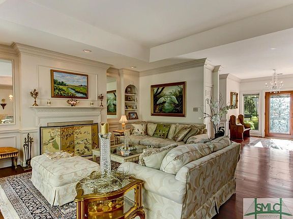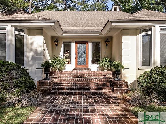 Beautiful stucco Plantation home with golf/lagoon view. Brick entrance opens to large foyer with views straight through home. Tons of glass and morning sun. Heart pine floors, deep moldings, Pella windows, Peachtree doors, 2 gas fireplaces. Open kitchen with granite and beautiful backsplash, large center island, new appliances. There is seating at bar plus breakfast area. Abundant cabinetry. Large master with "wow wakeup" view. Permanent stairs to large floored attic could be bonus room. Brick terrace. Wonderful traffic flow.