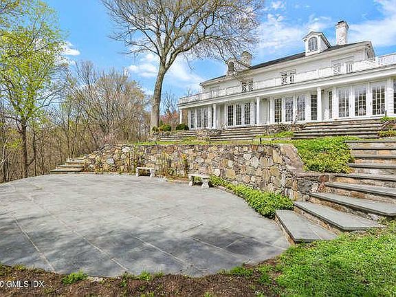 A 5 bedroom center hall Colonial with open floor plan sits on 2.94 acres atop a hill crest only a few minutes from downtown Greenwich amenities and most private & public schools. Walls of floor-to-ceiling windows flood this home with sunlight and offering breath taking sunsets. 1st floor rooms, including the master suite, have French door access to a tiered stone patio. Double height foyer leads to elegant formal rooms with fireplaces; sitting room; eat-in kitchen; family room with fireplace; paneled library and private 1st floor master suite with walk-in closet. 2nd floor reveals four spacious bedrooms, two with en-suite baths and a shared bath. A large suite w/ cabinetry and parquet floor above the attached 3 car garage. Walkout lower level boasts playroom, bar, bath and gym. Pool site.