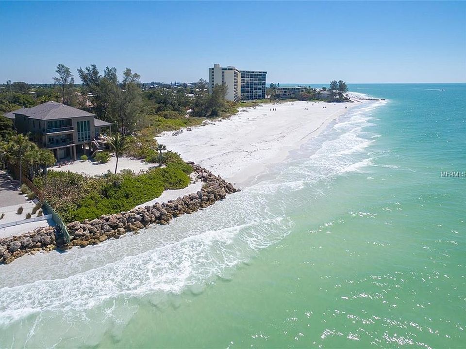 Nestled in the trees overlooking rolling waves from your private beach is this custom-built home rising high to the Gulf of Mexico shore. Thoughtful décor and architectural design capture the eye, creating comfortable gathering spaces. The pool and spa, keenly situated between the home and guest house, is wrapped by an extensive terrace, extending up to an outdoor kitchen and more spaces to take in the serene views. Double doors open the home to a cozy foyer with herringbone patterned flooring and immediately to the office/library with heightened wood bookcases. The family room offers an intimate sitting area with built-in banquet and 28-foot ceilings of tongue-and-groove wood. The true heart of the home is the kitchen centered between the family room and dining room, boasting a 16-foot black granite island, elements of pine, cherry and distressed painted wood cabinets complementing the glass tile backsplash and farmhouse sink. A bright dining room, with glass French doors leading to the terrace, brings the beach views inside, while grand windows flood the living room with light and panoramic ocean views. Completing the first level is the master suite with terrace access and two individual bathrooms. The second level provides an additional master suite with private balcony and en-suite, and two bedrooms with private baths. A three-stop elevator takes you to ground level to your personal waterfront sanctuary. All this within walking distance to the village and a short drive to downtown Sarasota.