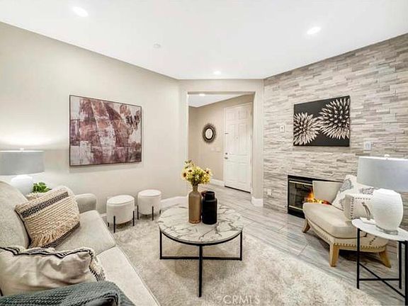 Experience idyllic Ladera Ranch living in this meticulously remodeled Greenbriar end unit. This 3-bed, 2.5-bath home spans 1,736 sq ft, boasting porcelain floors and granite walls. The open floor plan seamlessly connects living spaces, revealing stone walls, vaulted ceilings, and ample natural light. A gourmet kitchen with waterfall marble countertop, granite backsplash, and stainless steel appliances awaits culinary enthusiasts. Outdoor living is elevated with multiple patios for entertainment or relaxation. The upstairs sanctuary includes a spacious primary suite with a large walk-in closet, dual vanities, and a remodeled shower. Two well-designed guest rooms feature open space and large baseboards. The upper level showcases a homework niche and a completely re-designed guest bathroom with granite and floor-to-ceiling customization. Modern comforts abound, from tile floors to LED lighting. The two-car garage comes equipped with a 220V EV charger and ample storage solutions. Located across from Founders Park, pools, courts, and award-winning schools, this residence embodies comfort, style, and convenience. Welcome to the heart of Ladera Ranch, where true luxury meets architectural excellence. Furniture not included.