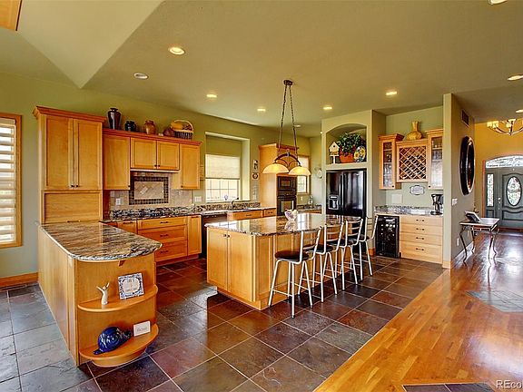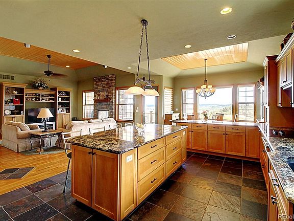 Beautiful custom ranch in Pinion Bluffs Estates of Castlewood Ranch, with magnificent views of Castlewood Canyon and beyond, and gorgeous sunrises! A rare find within the town limits! This is a well constructed home with excellent layout and quality materials. Comfort abounds with views galore in this 5 bedroom, 5 bath home - 4 en suite. Family, dining and octagon-shaped study/office have 12 foot exposed wood ceilings. A stone surround gas fireplace in family room is dual-sided so it can also be enjoyed from the covered deck. The well appointed spacious kitchen features 8 ft granite slab island with seating for 4, 8 ft peninsula, large walk-in pantry, an abundance of cabinetry. 3 bedrooms on main level, 2 en suite. Master bedroom shares dual-sided gas fireplace with master bath which features luxury spa-like 5 piece bathroom, separate granite counter vanities, claw foot tub, euro glass shower, large walk-in closet. Main level laundry room with sink, large counter and lots of cabinetry. The garden level boasts 10 foot ceilings with lots of windows! 2 large bedrooms en suite, 2 large open areas for recreation/work/entertaining, media room with soundproofing, large storage room with built-in shelving. This home has low-e double pane windows throughout, solid wood doors, 5" baseboards, soundproofing, surround sound, central vac, whole house humidifier. A must see for views, flexibility and space, yet within the city limits of Castle Rock.