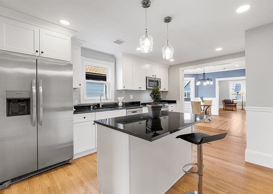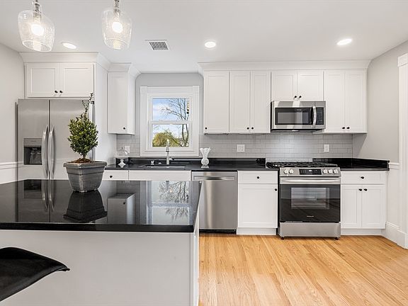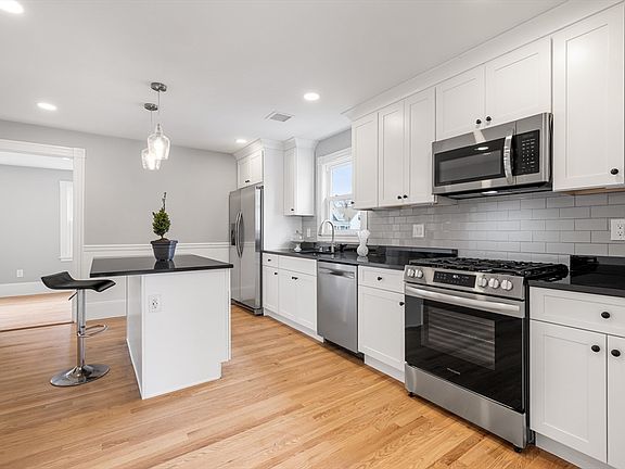 Newly renovated 5 Bed 2 Bath 1870 Square Foot Condominium in Medford, townhouse style duplex, with an open floor plan and lots of sunlight. Quick commuter access to Boston and Route 93. Systems are completely redone, including 2 zone central air, central heat, plumbing, and electric. New windows, siding, roof, and front porch create great curb appeal. Featuring a modern kitchen, with granite countertops, shaker cabinets, island, gas range, and stainless steel appliances. Spacious living room and dining room flow through french doors, with luxurious wainscoting and crown molding. Slate tiled bathrooms, and in-unit laundry. Hardwood floors and tall ceilings found throughout. Basement has a freshly poured concrete floor with a large amount of storage space. Excellent alternative to city living, just 6 miles to downtown Boston and a half mile to the Orange Line and Commuter Rail. Nearby to shopping and a list of popular restaurants.