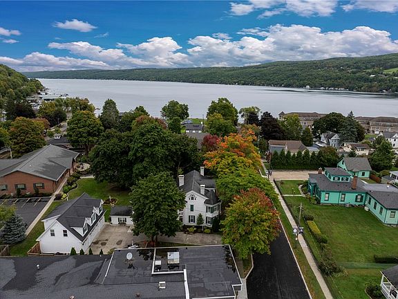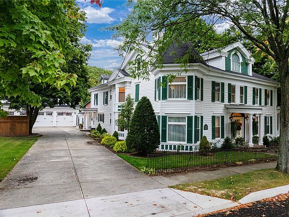 Beautifully restored historic 1825 home in the heart of Hammondsport. This large, totally updated property has so much charm & character. Features include original hardwood floors & door hardware, marble bathrooms, Kraft Maid kitchen cabinets w/granite counters & stainless steel appliances, gorgeous baseboard & crown molding, & 2 covered side porches that add serene outdoor space in a beautiful setting. The first floor has a living room, family room, library/formal dining room, walk in butler pantry, eat-in kitchen, exercise room, & 1st floor guest room w/full bath, front & back staircases. The 2nd floor features a owners suite w/2 walk in closets & whirlpool tub; 3 bedrooms, 2 full baths, an office & laundry room. Finished attic offers more living space & there is storage & built ins throughout. There is an additional 1200 SF remodeled studio apartment & full bath in the 4 car garage/carriage house. Walk to the village square & Keuka Lake front in minutes. Currently being used as a home w/a successful 2 room Bed & Breakfast & a short term rental. Possibilities could include a gorgeous year round home, vacation home, Bed & Breakfast, short or long term rental or a combination of.