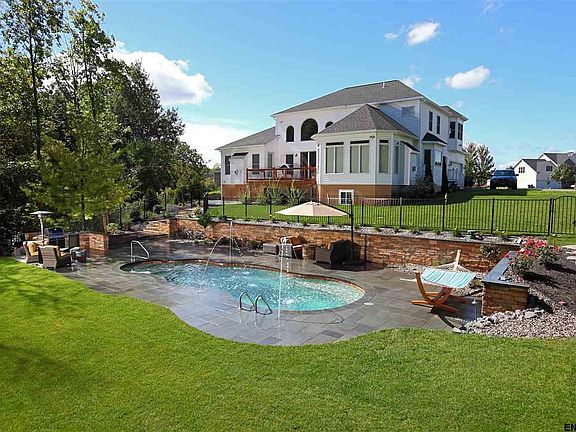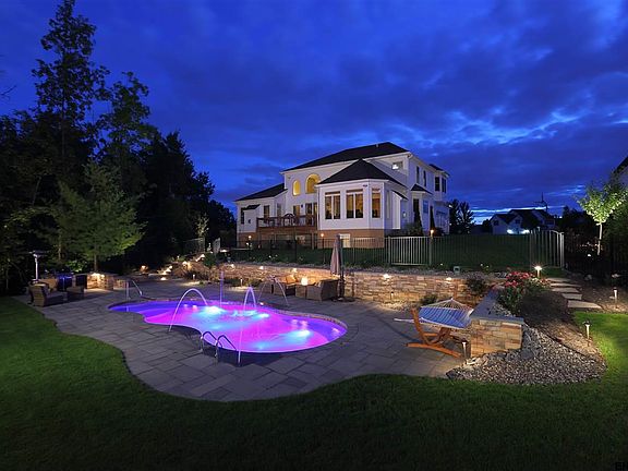 Welcome to your dream home! This custom built features 4 ensuite bedrooms, first floor master, w/ a gas fp, french door to a great deck over looking 4 acres of wildlife, custom bluestone patio w/built-in grilling station, fire pit, fiberglass pool w/ fiber-optic lighting, wireless speakers & professionally landscaped yard. Dramatic ceilings, gourmet kitchen, sunroom w/custom motorized blinds, huge finished basement w/tray ceiling, nest thermostat, Tesla charger, mudroom w/built-ins, let your memories begin!