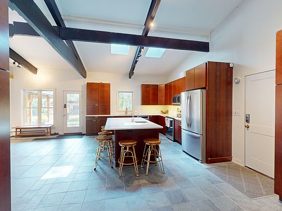 Tucked away on a sprawling, private 15 acre lot just minutes from downtown Hudson, this fully furnished modern retreat offers the perfect blend of style, space, and seclusion. Designed with clean architectural lines and mid-century flair, the home features soaring ceilings with exposed beams, large slate tile floors, and sun-drenched living spaces framed by oversized windows. The open-concept layout includes a chef's kitchen with custom cabinetry and a generous island, a sophisticated dining area crowned by a sparkling chandelier, and a cozy living room with a fireplace and built-in entertainment center. Multiple lounge areas offer panoramic views of the lush, wooded surroundings. In addition to the main home, a separate studio space provides endless possibilities, perfect for a home office, art studio, or guest suite. Outside, the expansive grounds include open lawn, mature trees, and a garden ideal for growing vegetables, herbs, or flowers. This one-of-a-kind property delivers elegance, comfort, and privacy just 2 hours from NYC. The home comes fully furnished (down to the linens and towels) and utilities are included, so it is truly turn-key!