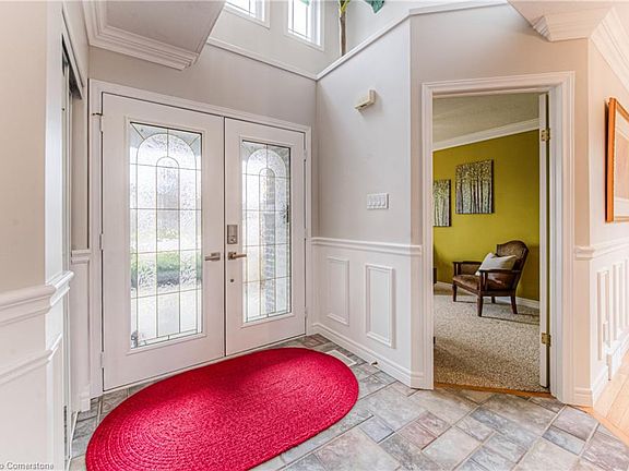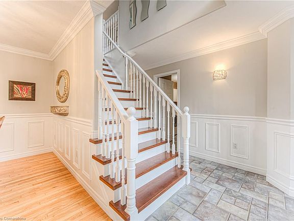 Discover a meticulously crafted 4 bed., 4 bath family residence that seamlessly blends elegant living with outdoor splendour. Nestled against a lush greenspace, this home is an entertainer's dream and a gardener's paradise. The expansive, professionally landscaped backyard features striking armour stone walls, bespoke raised garden beds, and mature foliage, creating a serene oasis. Enjoy outdoor gatherings on the elevated deck with a gazebo or the sheltered lower patio accessible from the walk-out basement. Inside, nearly 3,000 sq. ft. of refined living space caters to growing families, with potential for an in-law suite. A versatile front room serves as a home office, den, or music room, while the custom kitchen, adorned with granite countertops and a glass tile backsplash, flows effortlessly into the dinette and sunken family room. This space is bathed in natural light, showcasing hardwood floors, tray ceilings, and a cozy gas fireplace. Custom upgrades abound, including crown molding, wainscoting, and tray ceilings. The primary suite is a true retreat, boasting double doors, dual closets, tray ceilings, and a luxurious 5-piece ensuite. Three additional bathrooms ensure comfort for all. The finished walk-out basement is an entertainer's delight, featuring a custom solid wood bar with a brick accent wall, a games area with room for a pool table, and a recreation space with a gas fireplace. A heated garage with a workshop and ample parking adds to the home's appeal. Ideally situated near schools and with easy access to major routes, this home offers a tranquil yet connected lifestyle.