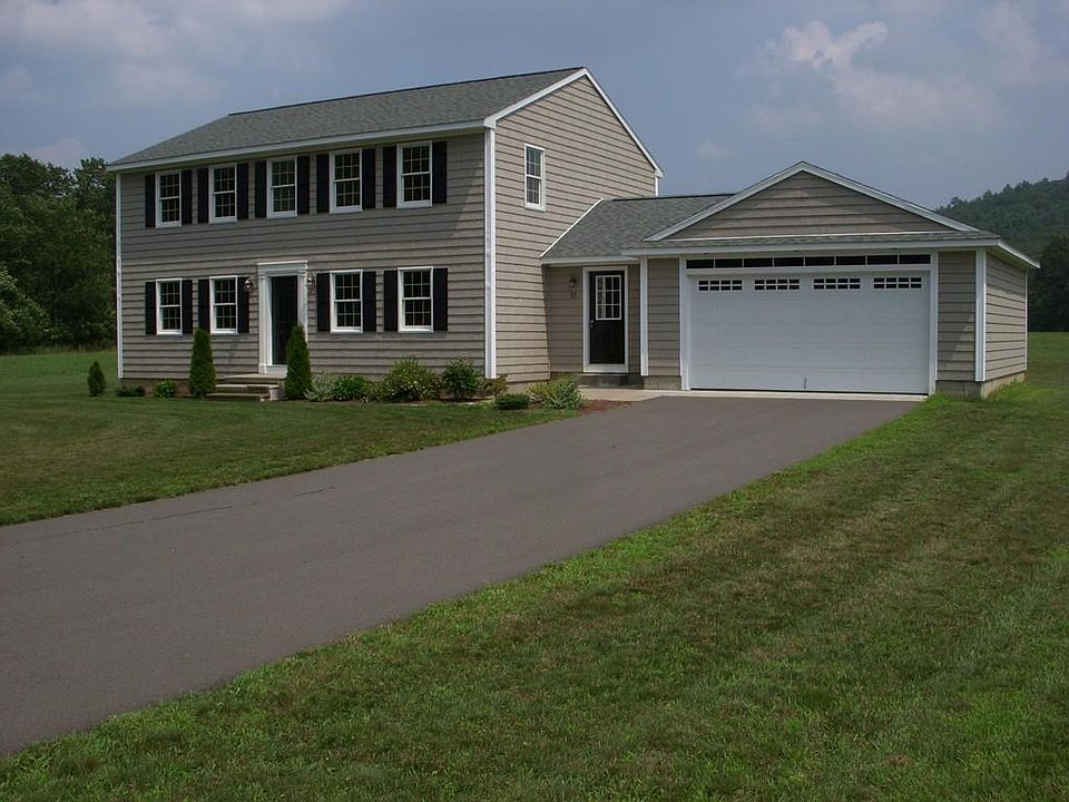 7 year young, 2,260 square foot open concept colonial. First floor has oversized cherry kitchen with granite counters (large 9 foot center island). First floor laundry conveniently located just inside 2 car attached garage. Tiled entry foyer opens up to formal dining with hardwood floors which is open to kitchen, divided by column. Front to back living room offers gas fireplace and sliders to deck, perfect for enjoying the sounds of the summer. Second floor offers 3 beds, center bath and master with tiled oversized shower. Bedrooms are carpeted, baths are tiled. Very large dry basement, best well water around. This home is on 1 acre. Quiet area yet close to amenities. Greenfield and Amherst 12 minutes, Northampton is a 20 minute ride. Propane Gas heat/hot water/ and propane gas stove. Propane tank is buried and owned.