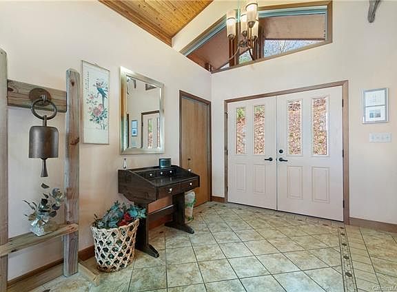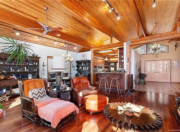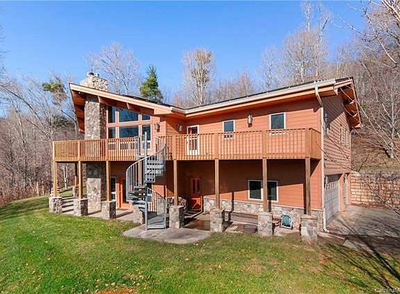 Rarely you will find a mountain home as meticulously cared for as this custom-designed Lindal Cedar Home, with year-round views of Mount Pisgah. Powered mostly by solar panels and geothermal energy, you'll have everything you need, including privacy. Touches of elegance and functionality are evident throughout; the kitchen includes cherry cabinets and a granite countertop island with a built-in Bosch dishwasher and custom wine rack. The double oven and extra counter space make entertaining a breeze, along with a wet bar with bar seating for guests, so they can enjoy spectacular views while you whip up their favorite cocktails. The wood fireplace makes a wonderful focal point to a room that boasts Brazilian cherry wood floors and soaring vaulted ceilings with exposed beams. The primary bed and bath on the main floor include a walk-in closet with custom shelves, a soaking tub, and marble countertops. The finished basement has additional rooms, a family room, and a separate entrance.