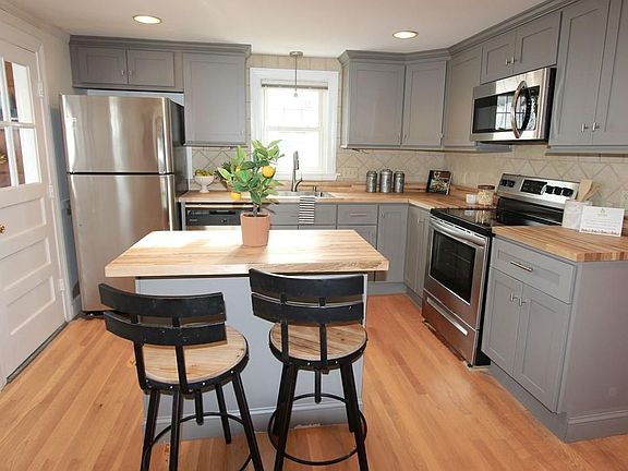 Found on treelined Sycamore Road, this lovely home sits on a beautiful lot in the Mt. Hood Golf Club neighborhood of Melrose. This 3BR house has tasteful renovations throughout bringing together modern style and family charm. It boasts a brand new Kitchen with stainless steel appliances and a kitchen island bar, a finished basement and a newer high-efficiency heating system installed in 2015 completing conversion to gas. Upstairs features 2 bedrooms with wall to wall carpeting and a half bath. Located near public transit and Haverhill commuter rail line, walk to the corner of Laurel to take Bus 131 to Oak Grove T-station, Orange Line into Boston. Easy commuter access to Rt 1 and Rt 93. Easy access to many parks in the area including Towners Pond with fishing, ice skating and walking trails. Additional photos to follow. Open houses this weekend regardless of weather. Showing to start after first open house. Offers if any will be reviewed Tues.