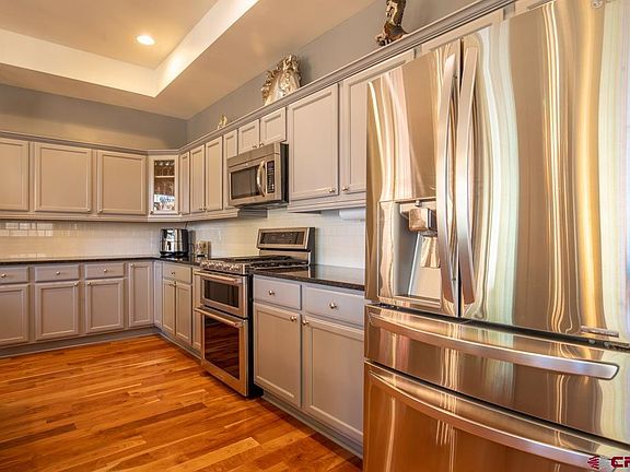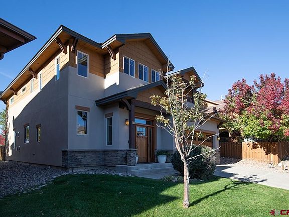This 2007 Parade of Homes "People's Choice Award" winner is a "must see!" Carefree living is yours in this lovely 3BR/2.5BA townhome in the heart of Durango! Customization/upgrades includes a Phantom Screen front door, an extensive gourmet kitchen remodel with granite countertops, recently replaced stainless steel appliances (refrigerator, range/oven (dual fuel) and dishwasher), and an abundance of beautiful cabinetry, custom lighting and a new, custom gas fireplace and high-end washer and dryer. High-end finishes such as cherry hardwood floors on the main level, custom tile work, patios, balconies, and walls of windows that provide ambient lighting and gorgeous mountain views. Off of the spacious dining area, there is a large privacy-fenced patio area enhanced by a new hot tub that is perfect for outdoor entertaining. This patio sits adjacent to a large common area providing additional privacy and views. 3 large bedrooms and an office/den offer additional comfort and functionality. The luxurious primary suite has a sitting area, private balcony and 3-season enclosed porch; a large walk-in closet with closet organization system, and a primary bath with a garden tub, separate shower, dual sinks, and beautiful tile work. A little bonus - the owner finished/painted the storage area under the stairwell that could be used as a little playhouse, etc. A two-car garage has ample space for extra storage. This home was built during Phase I of Tierra Vista Village by a quality builder, The McCullough Group. It is located close to the Hillcrest Golf Course, schools, walking/hiking trails, Fort Lewis College and is just minutes from downtown Durango.