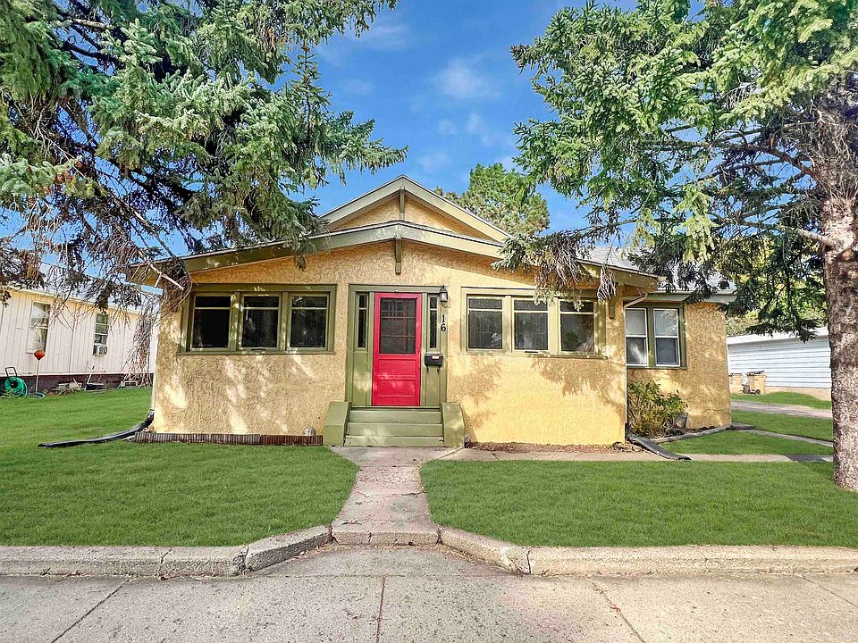 Situated just moments from Broadway and Minot State University this well-kept stucco home is perfect for quick get aways to the coffee shop before work or class. The front entrance of the home features a classic enclosed porch with vintage entrance hardware attached to an eye-catching red door. Stylish Refinished Hardwood Floors flow through the home offering a cozy aesthetic when combined with all the natural light illuminating in from the porch and other windows. Passing through the living area you will find a dining room perfect for family dinners and open to the kitchen. Bedrooms 1 and 2 are hardwood and are on the main level. The master offers a wall-to-wall closet. Traveling through the Kitchen you will find a second attached porch that provides access to the fenced back yard and the basement. The basement offers a semi-finished family room, laundry room, workshop area, storage room and potential for a second bathroom. The home is a great investment property or single family home.