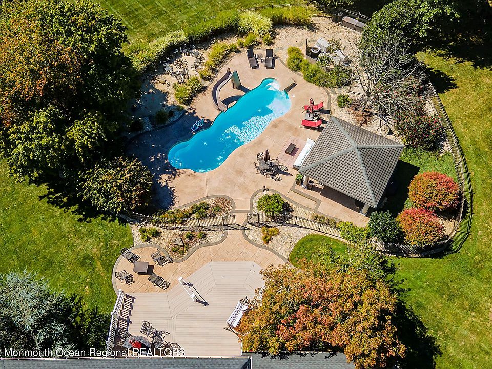 Backyard oasis in Millstone Township! Brick front home w/ 4 bedrooms 2.5 baths in The Meadows neighborhood. Two story entry, large eat-in kitchen with Thermador cooktop/indoor grille, walk in pantry. Cathedral ceiling in sunken family room w/wood burning fireplace. Dining room and living room. Large first floor office 15X15. Cathedral ceiling in master w/ THREE walk in closets and fireplace. Third closet is 15 X 7. Master bath w/ skylight renovated in 2022. 3 Additional bedrooms & full bath upstairs. Fully finished basement is bright & spacious- currently used for full gym, seating area and game room; 20X8 foot storage closet. Two car garage w/ attic storage, second refrigerator and doggie door. Heated, saltwater pool w/ underwater LED lighting, slide & diving board. 20X20 pavilion for outdoor gatherings, television. Pentair System controls pool and outdoor lighting from smart phone app. Private sandy beach for children or adults and large 'beach fire pit'. Giant vinyl deck (36X15) with a wide staircase. Paver walkways, patio, invisible dog fence. Attic storage- partially floored. Roof 2019. Water pump-2022. Lawn irrigation system for grass and plantings. Security cameras and alarm monitoring.