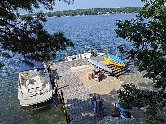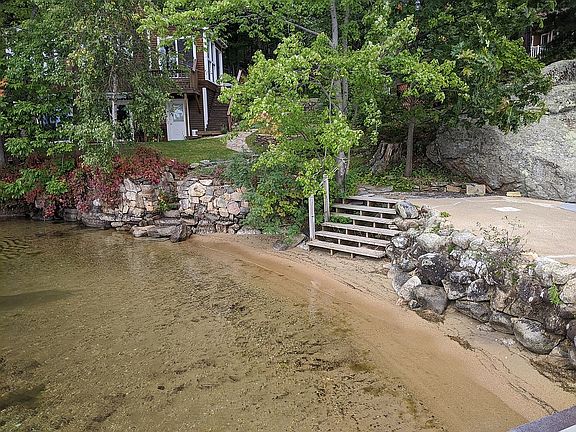 Varneypointforsale.com Listed by owner CALL: 6032938200 (603) 293-8200 135 ft water front. Deep water, L-shaped dock, room for 2- 30+ ft boats, private natural sandy beach. Less than 10 minutes to Gunstock, restaurants, stores. The main level has a full size washer/dryer, remodeled full bath(walk-in shower), 2 bedrooms, office/sitting room/small bedroom, dining room, large living room and kitchen. Large redwood deck off of kitchen and a deck on lakeside for sunsets. Finished walkout level has a washer/dryer, 3 bedrooms, summer kitchen, family room and full remodeled bath(large tub, separate walk in shower). Yard has stone walkways and walls, large detached side deck (sun and shade), flower gardens, both shade and sunny areas to relax. Parking has room for multiple vehicles: cars, boats, and/or rv.