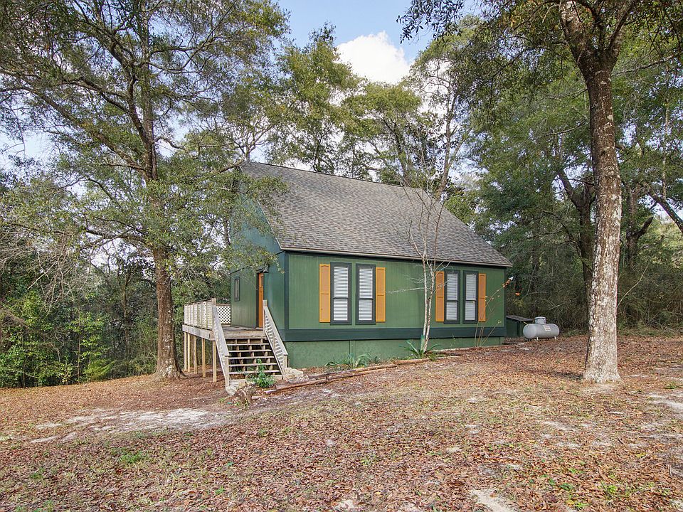 Charming, fully updated cabin nestled on a peaceful, wooded 1 acre lot, located perfectly between DeFuniak Springs (appx 7-10 min to downtown) and Crestview. Looks and feels more like the mountains than FL! Sweeping scenic views from both lower and upper decks. The soaring ceilings make this 1200sf home feel much larger. With new paint and lighting inside and out, new roof and new HVAC, there's no deferred maintenance worries. The LVP is also newer in a light, neutral shade. The master suite is on the main floor, with new double vanity and tile shower + laundry included. Upstairs is the 2nd bedroom and bath with balcony, alongside a loft space that would be great for a home office (or could even be converted into a 3rd bedroom). Recently rented for $1900/mo -or could make a great Airbnb!