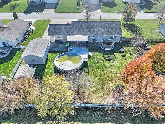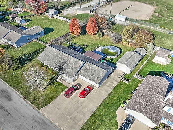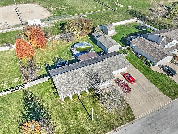 Small-town schools and great ranch home. Enjoy sitting on the front porch or step out back. A fenced yard gives peace of mind and backs up to the elementary school. The above ground pool is great for summer entertaining! Kitchen has Granite counters, pantry with roll-outs and undermounted lighting and steps out to the covered patio. And, between the eating area and garage is a wonderful storage area with desk and laundry. Master bedroom has an electric fireplace and attached bath with double sink, new step in shower and walk-in closet. Lower level has a large rec room with gas fireplace, additional spaces for a den and office and a full bath. Plenty of storage space too, with a stairway direct to the attached garage. The 26x16 detached garage is great for a workshop, or extra vehicles. The shed holds pool supplies. There's also a concrete drive and parking space for a motor home. New furnace/AC with 10 yr warranty (Inst. Nov 2024). New roof-house/garages and shed June 24.