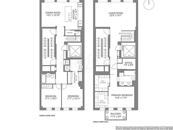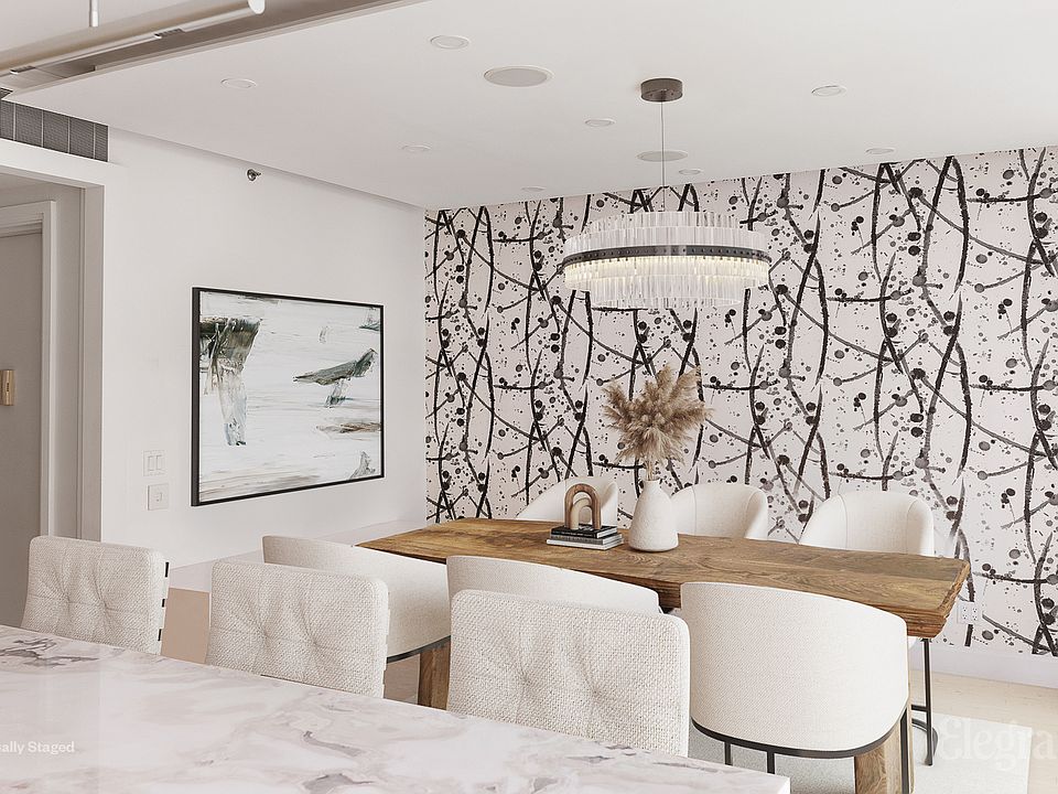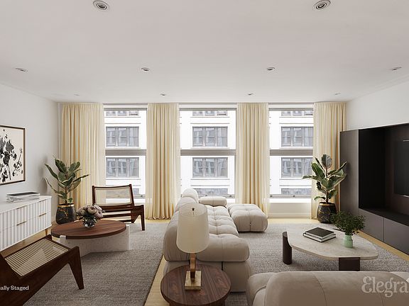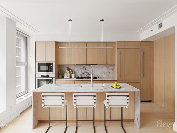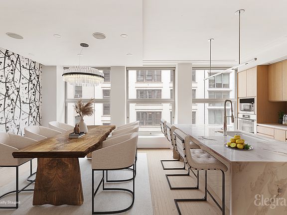 All appointments must be confirmed prior to viewing. Located in the vibrant Flatiron district, this exquisitely redesigned duplex spans the entire eighth and ninth floors of the boutique condominium at 16W21. With private elevator access on each level via a key-locked elevator, this home epitomizes modern urban luxury and privacy. Expertly renovated by the acclaimed architect West Chin, the apartment features a sophisticated layout that maximizes both space and light with 9.5ft ceilings and floor-to-ceiling windows throughout the home. The eighth welcomes you with a state-of-the-art chef's kitchen, featuring Japanese marble countertops, bespoke millwork, and premium appliances by Miele and Sub Zero, including a custom wine fridge and an oversized pantry. The kitchen extends into an expansive dining area, designed for both intimate gatherings and entertaining. Down the entire length of the hallway you will find custom closets with beautiful wood paneling leading you to the first full bathroom, the laundry room and two king sized guest bedrooms which can be used for a multitude of needs. The larger bedroom also features an en suite bathroom with two large custom closets. A sleek glass staircase guided by more custom paneling and accent lighting leads you to the upper floor and opens up to a sprawling loft style living room, perfect for relaxing and large enough to host a variety of gatherings. The hallway to the primary suite has more custom storage and a large home office. The office was originally a powder room that can easily be changed back to accommodate your needs. This level can also directly be accessed via the private keyed elevator. Enter the lavish primary suite where you have a double vanity bathroom with more custom fixtures, heated floors and a stall shower. Two separate oversized walk-in custom closets have been built out to accommodate all of your storage needs. The primary suite is topped off with an expansive south facing balcony, perfect to decompress after a long day or enjoy your morning coffee. The residence is further accentuated by advanced home systems, including an integrated Sonos sound system and comprehensive accent recessed lighting and five zone central air system 16W21 is LEED Silver certified and offers amenities such as a doorman/concierge service, a spa and fitness center, and a communal roof deck with an outdoor kitchen. Centrally located on a quiet block just steps from some of the city's finest dining experiences, shopping and so much morethis duplex offers a perfect blend of luxury, comfort, and accessibility. Please note some photos have been virtually staged to protect personal belongings. *Please refer to floorplan for current setup of office in lieu of powder room.
