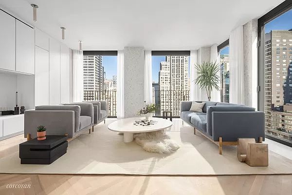 The Bryant is pleased to welcome you back and is now available for private in-person appointments with new health and safety standards. Please contact the sales team for a virtual first appointment and in-person follow up appointments. Located high above vibrant Bryant Park in the heart of New York City, this David Chipperfield-designed floor-through two bedroom residence with a windowed study boasts twenty two floor-to-ceiling windows wrapping three exposures. At 1,882 square feet (174.8 sq. m.), this home offers an expansive floorplan with an abundance of natural light and incomparable views of Bryant Park and the Empire State Building through Vitrocsa sliding glass doors with Juliet balconies. The custom terrazzo facade transitions seamlessly to the interiors, creating crisp architectural frames to the windows and a border for the heated oak herringbone floors. The residence's bespoke millwork cleverly conceals storage, appliances and mechanical systems, allowing continuous, full 9 foot 6 inch ceiling heights to carry throughout the residence. The open kitchen includes a Gaggenau cooktop with fully-vented hood, oven, speed oven, dishwasher, and refrigerator/freezer. The master bedroom with direct Empire State Building and city views includes a windowed en-suite bath featuring full-height Statuarietto marble walls, double vanity with marble top, and separate water closet and wet room with rain shower, both enclosed behind custom Bendheim glass doors. The secondary bath and powder room are also appointed with Statuarietto slab marble walls and vanity. Residences at The Bryant, located at 16 West 40th Street, sit atop a luxury boutique hotel. Amenities include 24-hour attended private residential lobby, lobby lounge, fitness center with sauna, Terrace Club with fireplace and full bar overlooking Bryant Park, and a full suite of a la carte hotel services including housekeeping and room service. Immediate Occupancy. 4% commission on new contracts signed from 8/19/19-5/31/20