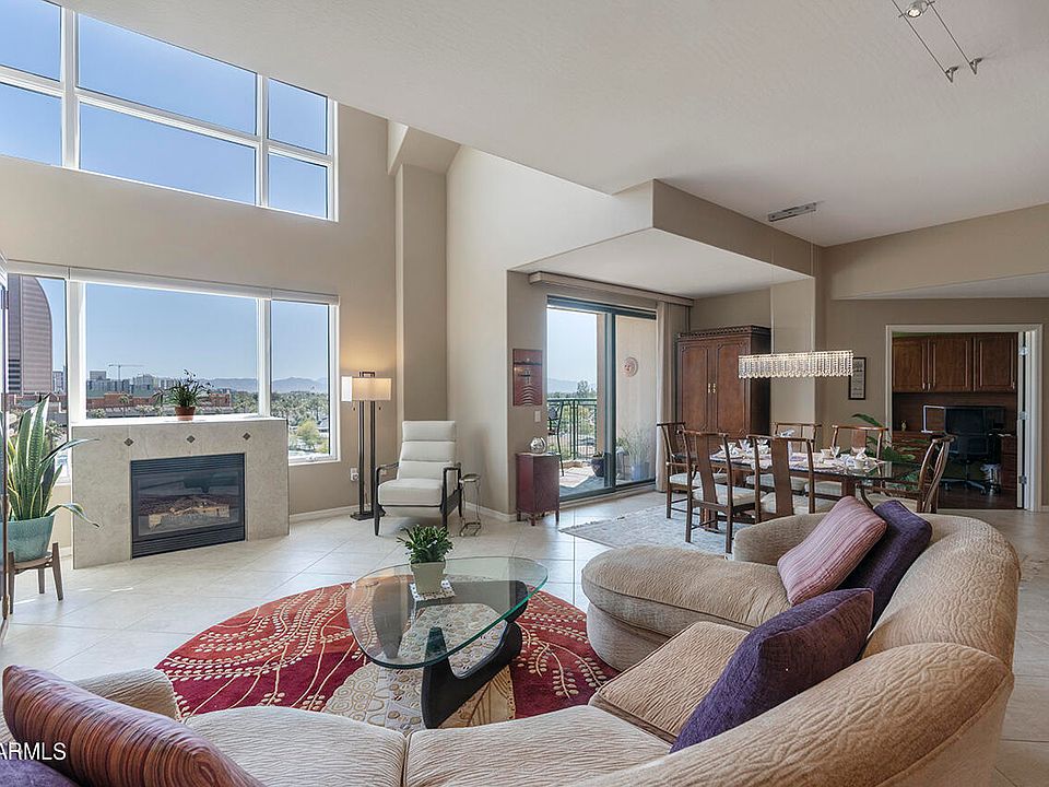 UNICORN ALERT! Discover the WOW factor in this amazing penthouse loft featuring breathtaking city views from two huge balconies. Fantastic floor plan with 2 primary suites, (one up and one downstairs)plus a den with wine fridge (Yaass!) and custom office built-ins, ambient gas fireplace, updated kitchen with espresso cabinets and gorgeous quartz counters plus a stunning wall of windows to enjoy the views. Tapestry on Central is packed with amenities: heated pool/spa, sauna, media room & fitness center. Prime location next to Symphony Hall, museums, and light rail. 2 car gated/guarded underground parking included. Having the Willo Historic neighborhood behind makes this idea for those who enjoy walks. This is just a great location, and hard to beat values for downtown living! A 10+ home!