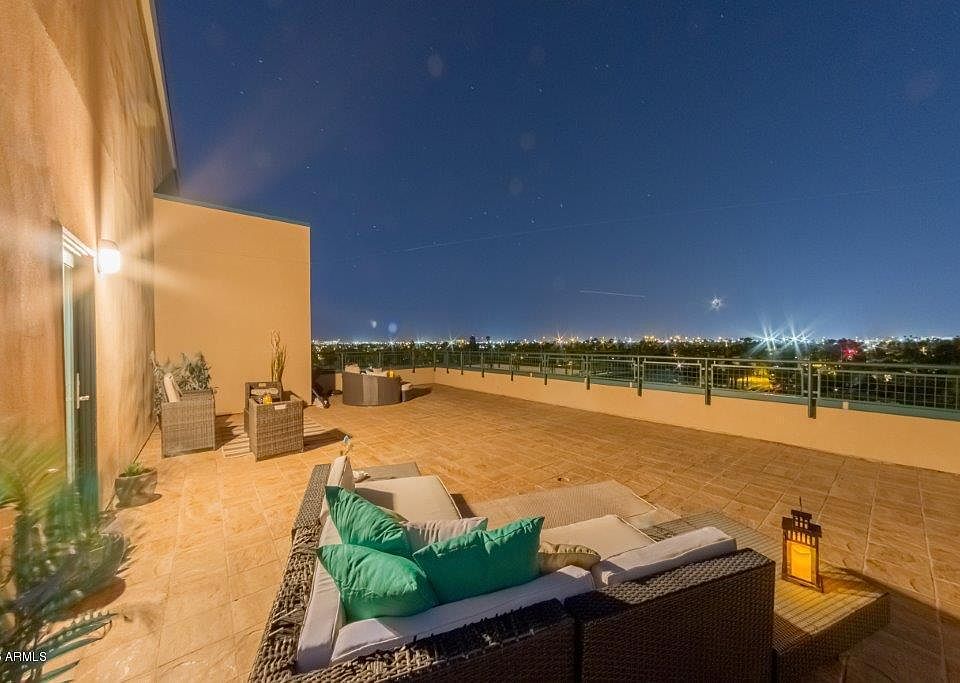 This spectacular corner penthouse is a rare find with breathtaking mountain views, the glittering lights of downtown Phoenix, and gorgeous sunsets. It features an exceptionally large rooftop deck boasting over 1,000 sq ft with fabulous entertaining possibilities, plus there are two more decks. Inside, upgraded features abound... You''ll fall in love with this smartly laid out space with an office/den off the master bedroom, built-in wine cooler, upscale touches of granite, travertine and hardwood, designer lighting, custom paint, and sliding blackout panels for the master bedroom. Location, location, location...You also have light rail at your doorstep and easy access to all that downtown Phoenix has to offer. A FABULOUS MUST SEE!