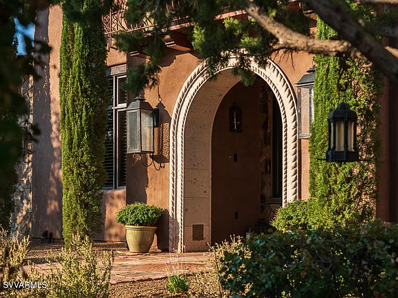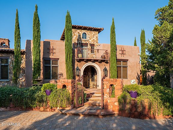 Located on the highly coveted cul-de-sac of West McCullough, this exceptional residence is on the market for the 1st time in the Mystic Hills. Designed by famed Sedona Architect Matt Dougan (Mariposa Restaurant), this beautiful 4200 square foot Italian residence has THREE Separate buildings and TWO separate parcel numbers.Enter through the iron gate to walk through the Canterra stone entryway archway, flanked with gas lanterns and fountain. Many window frames, fireplaces, and columns are also custom sculpted in Canterra stone. Domed vault hallway ceilings, a masterpiece five-sided dining room with grand fireplace, a custom iron staircase that leads to the entry tower's crown with massive Red Rock views; this home is a manifestation of dreams.