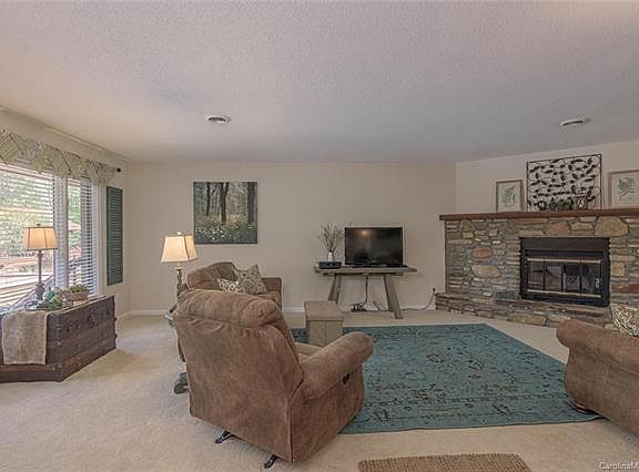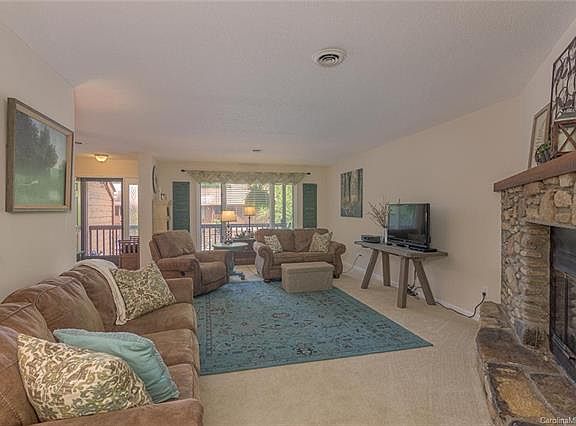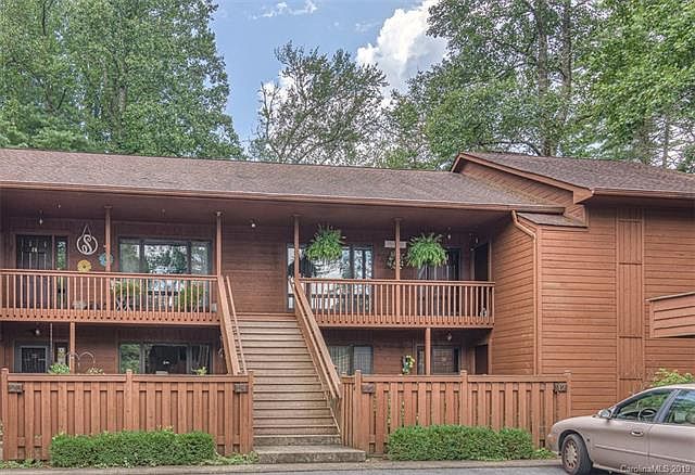 Beautiful move-in-ready upper level Woodsong One condo in an idyllic location to downtown Brevard shopping, dining, trails and Brevard College. This end unit has lots of natural light and a serene wooded view off sunroom. Spacious living room with a wood burning fireplace, cherry wood flooring extends from large entry way into the open galley kitchen with ample maple cabinets for storage, a large primary en suite with generous walk in shower and closet space. The second bedroom or office space with a hallway access bathroom with a tub/shower combo. Lots of extras include ceiling fans, full size laundry included, outside storage space, carport and extra car space.