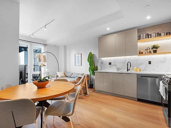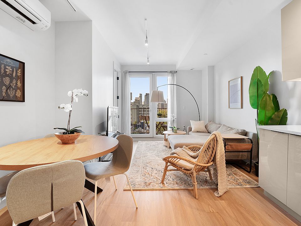 The kitchen flows into a sun-drenched living room with floor-to-ceiling windows, offering breathtaking city views, stunning sunsets, and the iconic Manhattan skyline. Whether you're relaxing on the couch or enjoying a meal, this space is designed for both comfort and entertaining.