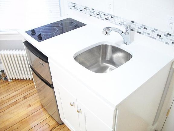 Studio alcove with bright windows and hardwood floors. Full-size kitchen appliances including gas stove. Laundry and elevator on-site. Cat okay.