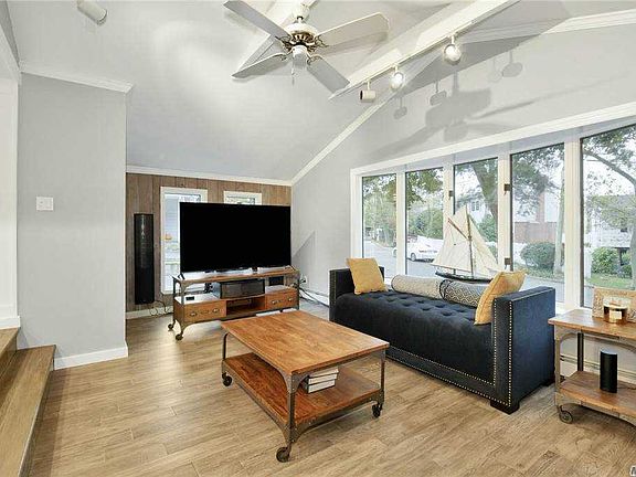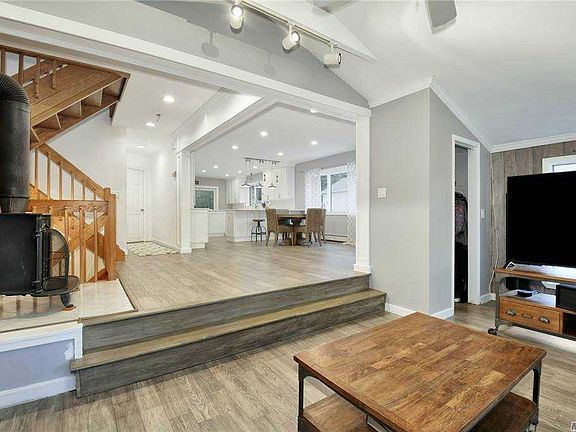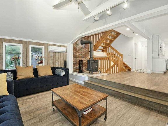 Looking for a vacation lifestyle? Been cooped up too long? Absolutely stunning contemporary in WATERFRONT COMMUNITY. 4 min walk to private beach w/low association dues. Fabulous open floorplan, soaring ceilings, sun-drenched rooms, balcony off master bedroom. New chef's dream kitchen, updated baths. Additional updates include: roof, ductless split ac system, alarm, first floor engineered hardwood floors, new exterior paint and chimney, Buderus burner, Franklin wood burning stove with internal brick chimney (significant $$$ saving on heating bills) 200 amp service, crown molding, separate drywell for washing machine. Nothing to do but unpack! Taxes with basic STAR $9,032. Won't last long.