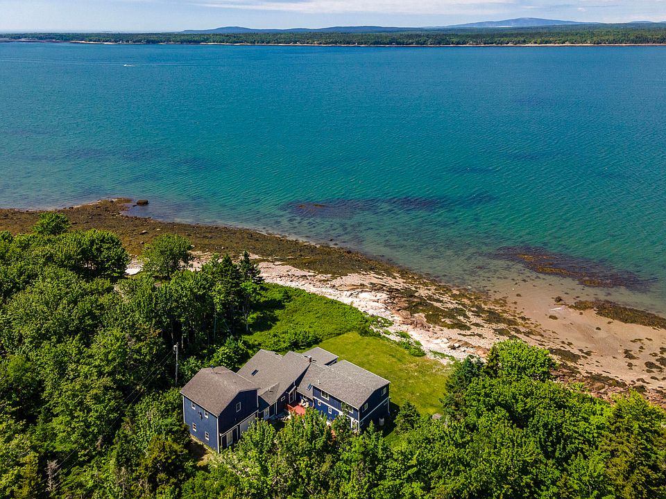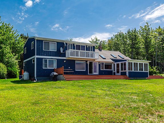 This waterfront home boasts stunning views of Gouldsboro Bay from nearly every room. It's unique design features an open kitchen and dining area that seamlessly flows onto a large deck, while the enclosed porch provides a cozy retreat. The first-floor primary bedroom leads to an attached spa room, complete with hot tub, sink and shower with direct outside access. The main level also offers a generous sized living room, a second bedroom, one and a half bathrooms, laundry room, and a versatile ''tv'' room that could be transformed into a home office. Upstairs, a spacious room awaits with its own private balcony offering serene views. An attached garage with a bonus bedroom and bathroom above complete this exceptional property.