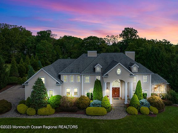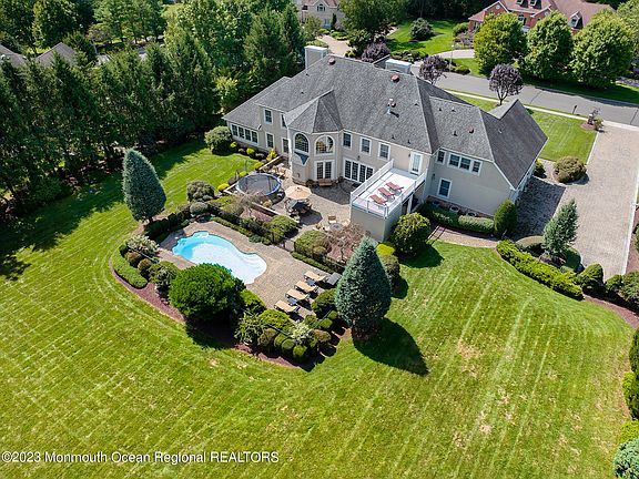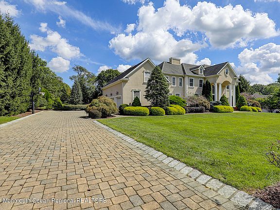 Step into your dream home in the heart of Holmdel, where opulence and comfort merge seamlessly. This remarkable residence spans an impressive 10,000 square feet, with 6400 sq ft on the first and second floors and an additional 3600 sq ft in the fully finished lower level. The layout is exceptional, highlighted by a grand two-story great room and foyer adorned with coffered ceilings, a versatile first-floor game room, and a sunroom. Dual staircases, front and back, enhance both convenience and elegance. For culinary enthusiasts, the kitchen is a true masterpiece, boasting a 60-inch Viking range, pot filler, Sub-Zero refrigerator and freezer, Miele dishwasher, and a fully equipped butler's pantry with wine and beverage fridges, and an ice maker. A walk-in pantry ensures ample storage. Throughout the home, nine-foot ceilings create an inviting and spacious atmosphere, complemented by warm 5-inch white oak flooring. Radiant heat on the first floor and in the primary bathroom. Upstairs, the primary bedroom serves as a retreat with a double-sided fireplace, a sitting room, outdoor balcony and three expansive walk-in closets. A second-floor laundry room adds practicality to your daily routine. A walk-up attic lends itself for the ideal storage place. Each of the three additional bedrooms on this level enjoys en-suite bathrooms and walk-in closets. The lower level is an entertainment paradise, featuring a half bath, meticulously designed wine cellar, and a state-of-the-art movie theater. Additionally, the 10-foot superior wall foundation ensures structural excellence. The three-and-a-half-car garage, with oversized doors and no columns, caters to car enthusiasts and hobbyists alike, offering separate basement access for convenience. Outside, the home showcases four-sided California stucco, 7000 square feet of beautifully designed pavers, and an inviting in-ground pool with a nearby full bath, creating a resort-like oasis in your own backyard. Set on a generous 1.17-acre lot, this residence seamlessly combines luxury with convenience, offering easy access to the Garden State Parkway, NJ Transit trains, and abundant shopping options. Welcome to your new life of Holmdel luxury, where every detail has been meticulously crafted to provide the ultimate living experience.