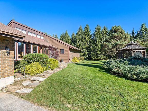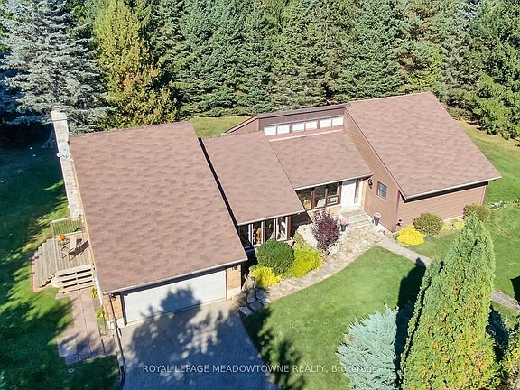 Fabulous bungalow on private 2 acre lot in prime location in Halton Hills. Quiet pocket of custom homes just minutes to Georgetown, Acton, the Limehouse kilns and Bruce trail. Lovingly cared for by original owners. The principal rooms are quite large and all have gorgeous country views. The family room features a wood-burning fireplace and gleaming hardwood floors. Enjoy the sun-filled eat-in kitchen with granite counters and a huge wall-to-wall pantry. The primary suite offers a walkout to the yard plus a 4-pc ensuite and two closets. Main floor laundry with garage and side door entrance. There is a massive lower level that is currently finished as a rec room with loads of room for the large pool table, exercise area and it also features a separate room ideal for a bedroom or storage space. Nature abounds this beautiful property with numerous evergreens and its own little backyard forest with trails. The two-car garage is oversize and there is a super long driveway for all your guests' vehicles and your toys too. Shingles 2018, Furnace rebuilt 2023, many updated windows. Survey available. Enjoy the peace and quiet of the country living just minutes to town.