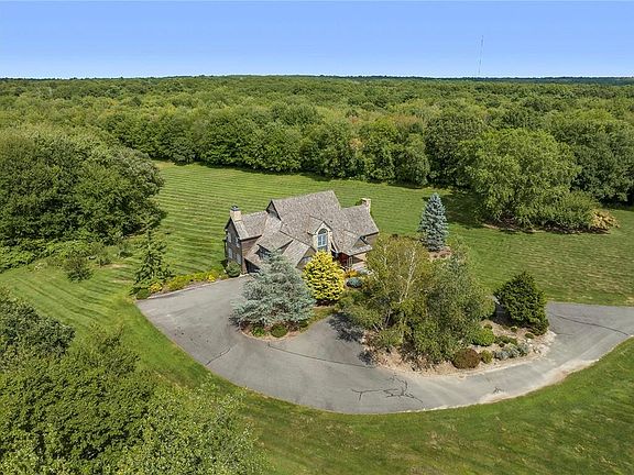Welcome to an Estate beyond Imagination! Discover the unparalleled craftsmanship and architectural distinction in this 4595 sf custom-built Timberpeg, post and beam home, set on nearly 25 acres of breathtaking landscape with added potential of buildable lots. Built to offer both luxury and comfort, this home is a true masterpiece blending rustic elegance with modern convenience. As you enter the grand vaulted foyer, you are greeted by a beautifully designed custom tile floor and one-of-a-kind copper chandelier. The heart of home, a sunken 24x24 great room, invites you to relax by the magnificent stone fireplace under vaulted ceilings. The chef’s kitchen features high-end stainless-steel appliances, stunning copper accents, walk-in pantry and large 10' granite island. Upstairs, two vaulted bedrooms with lofts provide extra living space, while the main suite is a sanctuary with a gas fireplace, vaulted ceilings, and spa-like bathroom with a walk-in shower, soaking tub, and huge walk-in closet. The third floor adds a versatile bedroom with vaulted ceilings, perfect for guests. Additional features include a massive walkout basement, five zone HVAC system, radiant floor heating on 1st floor and 2nd floor bathrooms, a Kohler generator and 3-car heated garage. The exterior boasts impeccable stonework, copper gutters, and wood gables, set in a serene, nature filled environment with grapevines and maple trees. Don't miss this rare opportunity to own an one of a kind Timperpeg estate!