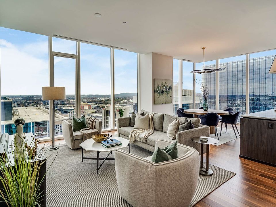 The most sought after address in Nashville! Towering high above Downtown, this gorgeous corner unit overlooks all of Nashville's most talked about and visited landmarks while sitting on top of the world renowned 5 star Four Seasons Hotel. Take in the Downtown sights from your unit, the resident only sky deck, pool, or multiple restaurant amenities on the ground floor or have room service delivered straight to your unit! The condo includes top of the line Miele appliances, automated blinds, designer lighting and more. Amenities provide 24 hour concierge, valet parking, spa, pool, residents lounge and sky deck, dog wash, room service options, and so much more! The ultimate in luxury living in the heart of Downtown Nashville!