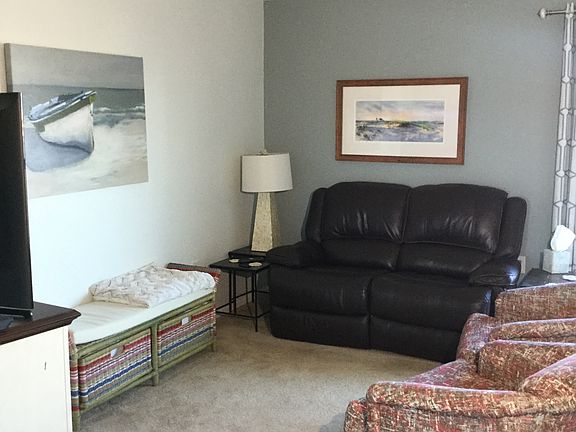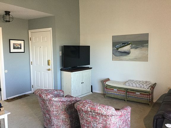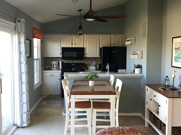 Two bedroom, one bath, open floor plan condo with large garage and separate storage/workshop.