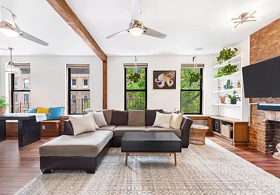 Open the door to a sanctuary you'll be proud to call home! 4 south facing windows invite natural light into your 26' wide room, highlighting the tall ceilings with a rustic beam accent. The newly updated open kitchen inspires dinners to be cooked with top of the line stainless appliances including Bosch dishwasher and Blue Star commercial grade gas range. Handsome stone peninsula countertop provides a roomy open canvas for assembling delicious creations and bar seating for your company. The corner banquette provides the perfect mis-en-scene for dining and directly adjacent, a lower cabinet extends the length of the wall thus providing plentiful storage and window seating to curl up with a book or to just gaze onto the Avenue. There's more than plenty of space for your sectional or comfy sofa to cozy up for conversation, laughs or to watch a classic movie together in the adjacent Living area. Commencing down the hallway, the full 2nd bathroom serves as a perfect powder room during get togethers. Close the pocket door shut in the hallway and create privacy between the living area and sleeping quarters. The first of the two bedrooms can be used as a home office, nursery or whatever your needs maybe. Continue to the rear of the building to the peaceful master en-suite, a pause from the stimulation of city living. Featuring walk-in closet, expansive master bathroom with whirlpool tub, 2 large windows and working fireplace in the bedroom. Unit also features washer/dryer for your convenience! Located in coveted north Park Slope, minutes from Prospect Park, close to transportation at Atlantic Avenue/Barclays Center Station, Union Street R and Farmer's Markets. A unique 1100 sq ft home with the convenience of so many amenities and restaurants is achievable. The opportunity awaits!