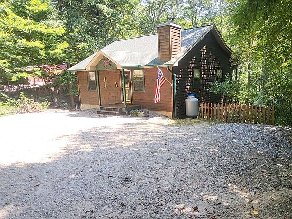 CHARMING & PRISTINE CABIN WITH Creek, 2 fireplaces, 2 out-buildings, fence plus wooded lot, remodeled bath, paved road, city water, high-speed internet (fiber optic available). Less than 3 miles to Blairsville! Walk into the open living area with rock corner gas log fireplace (stone) wood floors and pitched ceilings, coat closet, coffee bar, kitchen with granite countertops, glass sliding door to covered porch 30ft long. Full bath, nice-sized bedroom with tray ceilings, large laundry room with lots of built-ins for office or pantry/storage. Terrace level stairs that you won't hit your head on to huge bonus room with electric fireplace (stone) and under stair storage, tiled landing and antler stair railing decor, large bedroom with huge closet and full bath with tiled-in shower and great decor! Another full length porch with swing. Back yard is fenced and has a she shed/garden shed 12x12, path down to the creek with sitting area. Upper parking area has a carport and 10x20 shed with power, insulation and loft area. Parking for boat or motorcycle up by the paved road. 2 parking spaces and turn-around area in front of the house. All remaining items and decor come with the home! Owner just moved out, kept in like-new condition and many upgrades throughout! New roof 2015. Year-round flowing creek, house is out of flood zone, NO flood insurance needed.