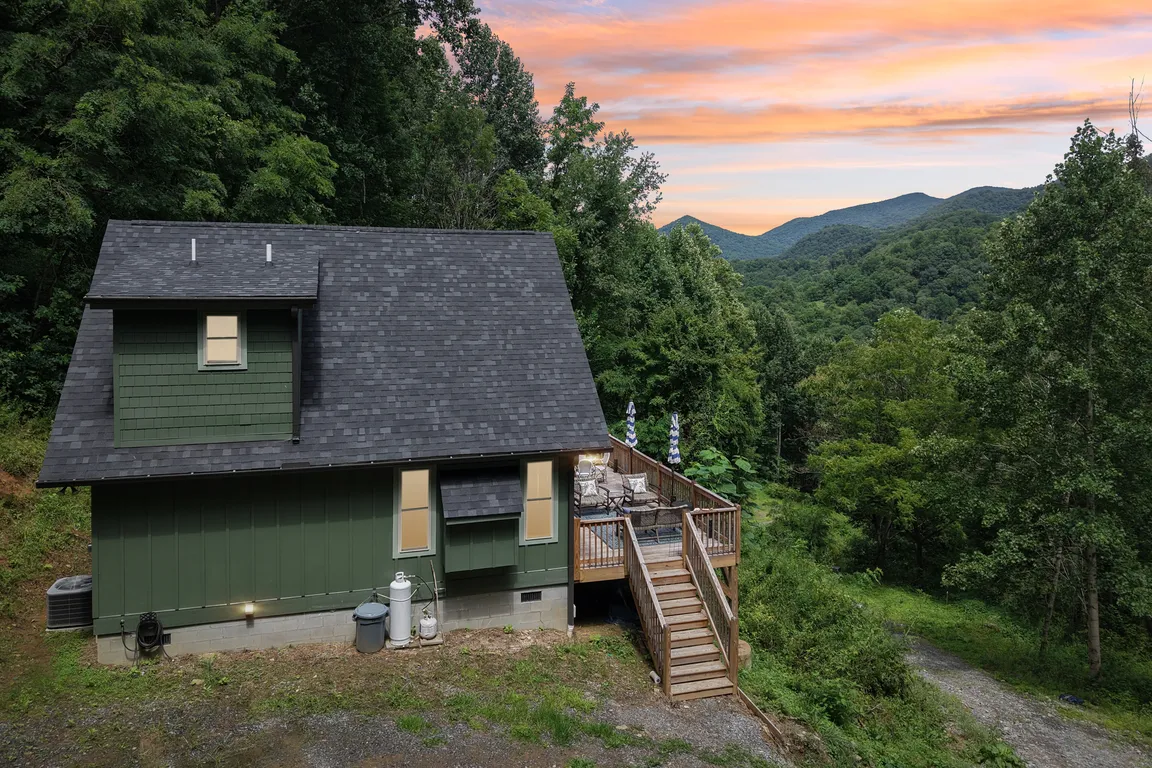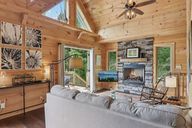 Mountain vistasWindows invite mountain scenerySoaring ceilingsWarm gas-log fireplaceTwo primary suitesComplete privacyGenerous deck