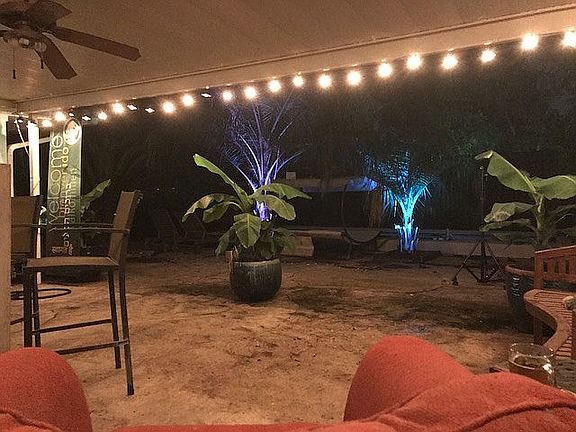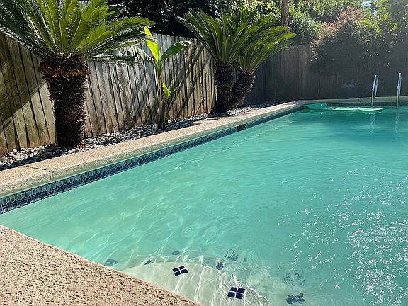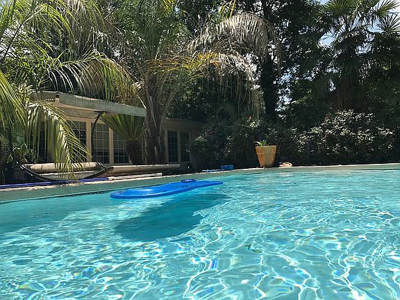 Beautiful tropical paradise for a backyard with over a dozen palm trees surrounding an inground pool. Mediterranean style interior with large, open-ended front room and large sunroom facing the pool area. Standard size Broadmoor bedrooms.