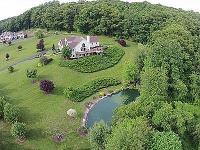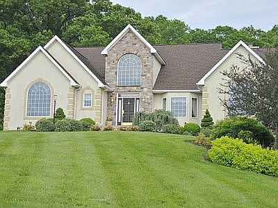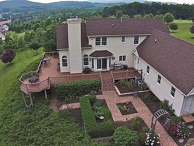 Imagine driving home down a beautiful country road to a small community of upscale homes into a cul-de-sac where the prettiest home of all was through the gate and up your own long driveway. You take a moment to pause and look out your front door at the simply spectacular view. Overlooking the valley you can see for miles to the purple hills beyond. Patches of multi-colored green, a white steeple, this is a view that holds your attention as it changes colors with the seasons. In the background you hear the splash of a waterfall and sounds of the birds as they visit your magnificently landscaped koi pond and grounds. The gardens are easy to enjoy from the multi-tiered composite deck that wraps itself around the back and sides of the home. A dramatic center hall entry greets you with grand Palladian window, oak staircase with painted balusters and plush stair runner with brass stair rods. Maple floors are found throughout much of the first floor. The formal dining room is to your right with a bow window to capture the view. Look up and you'll see the tray ceiling, ceiling medallion and the speakers for the whole house stereo system. The great room is huge with two story stone fireplace, recessed lighting; and a wet bar with beautiful cabinets, granite counter top, wine bottle racks, and bar refrigerator. The great room is open to the kitchen and breakfast room making entertaining easy. Pocket doors open to the wonderful sunroom with floor to ceiling Palladian windows. The kitchen features maple floors; gorgeous cabinetry with roll-out and swing out shelves, appliance garage, cabinet front refrigerator, Bosch double wall ovens with convection; Bosch dishwasher and a center island with multi-level granite top. To top it off there is a Jenn Air 4-burner electric cook top and seating area. Right next door is the amazing laundry/mudroom. This home features a first floor master suite with a beautifully equipped master bath. Vanity with two seamless sinks, Jacuzzi tub and separate shower with double showerheads Double doors lead back to the foyer. The second floor features three spacious bedrooms and a spacious hall bath. A floored attic provides wonderful storage space as does the full walkout basement with extra high ceiling height just right for finishing. Additional features include: security system, central vac, automatic hard wired Generac propane generator and much more.