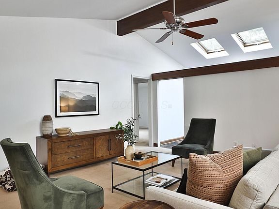 One of a kind custom Clintonville ranch located West of High! Unique features of slightly vaulted, wood beamed ceilings in the living areas! Fabulous kitchen with marble counters, cherry cabinets, stainless appliances plus an eating bar! Wood burning fireplace & floor to ceiling glass wall adorn the cottage style family & dinning room layout that opens up to the brick patio with flower beds! Living room boast vaulted ceilings and loads of natural light! Sunroom is perfect to enjoy fall evenings or your morning cup of coffee. Stone patio and private lot! First floor owner suite. 3 bedroom and 2 full bathrooms plus a first floor laundry! Freshly painted One floor living at its finest! roof 6-2024! 2 car attached garage! One block to the Park of Roses, Summer concerts & bike path! rare gem!
