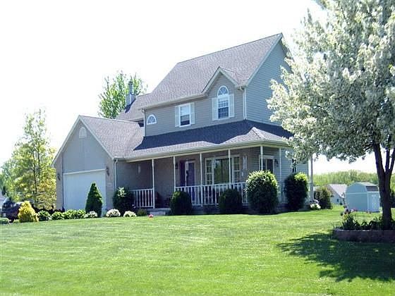 Immediate occupancy..Country home with wraparound porch and mature trees border the home for great curb appeal and is only the beginning for this 4 bedrooms, 2 1/2 baths with 2355 square feet on 1.07 acre lot. Fireplace in the family room. Master suite with cathedral ceiling and private bath. Walk in closets in 2 of the 3 other bedrooms. Home is wired for surround sound. 16x20 shed with electric, phone and 2 entry doors. 14x26 heavy duty deck with 220 power to support a hot tub. New upstairs bath vanities, ceiling fans in most rooms, flagstone textured front entry walk, invisible dog fence and ADT security system. 58 flat screen TV in family room and 42 flat screen in master bedroom stay with the house. Also, included is riding lawnmower. The basement has been waterproofed and warranty transfers to the new owners. One year Home Warranty with acceptable offer. Sidewalk and garage floor settling repaired; and work warranted.