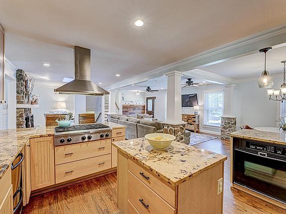 - Kitchen Features: Breakfast Bar, Cabinets Stain, Eat-in Kitchen, View to Family Room, Stone Counters, Kitchen Island, Breakfast Room, Wine Rack